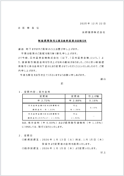 日本証券金融株式会社(以下、「日本証券金融」という。)より、貸借取引融資金利を引き上げる旨の通知がありました。これに伴い制度信用取引に係る金利を変更させていただくことといたしましたので、ご案内申し上げます。