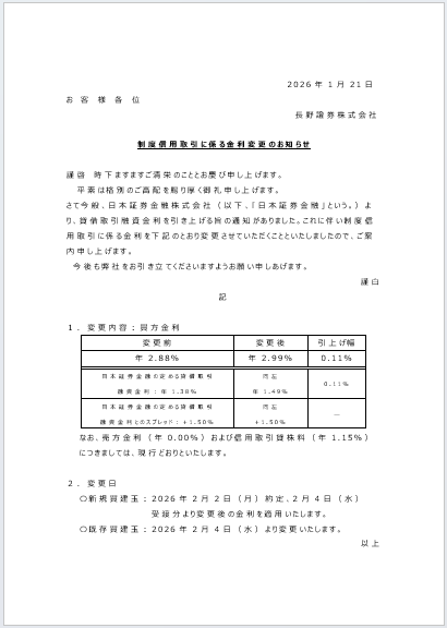 日本証券金融株式会社(以下、「日本証券金融」という。)より、貸借取引融資金利を引き上げる旨の通知がありました。これに伴い制度信用取引に係る金利を変更させていただくことといたしましたので、ご案内申し上げます。
