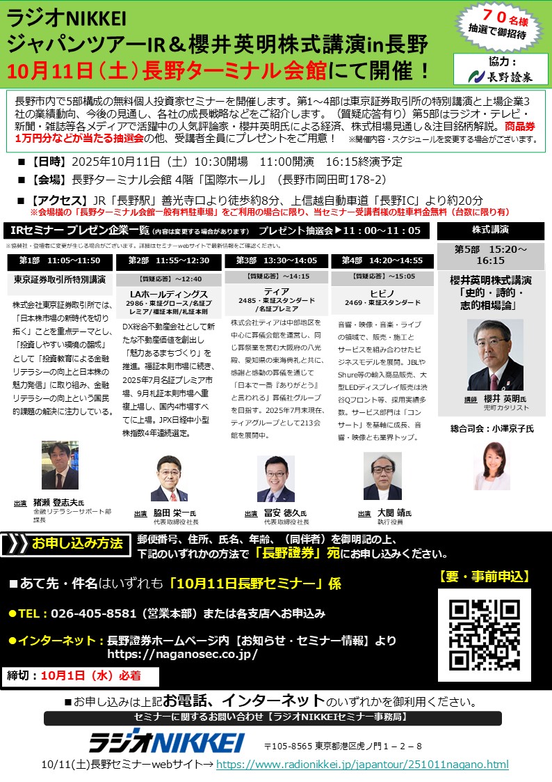 10/11(土)「ラジオNIKKEIジャパンツアーIR&櫻井英明株式講演in長野」お申込受付中